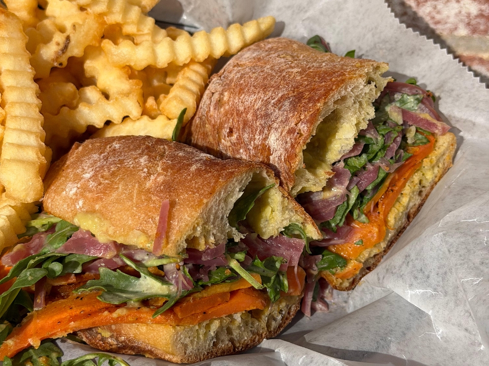 Roasted carrots, jalapeño hummus, arugula, and pickled red onion with avocado crema on a toasted Allez Bakery ciabatta. Served with fries and fry sauce.