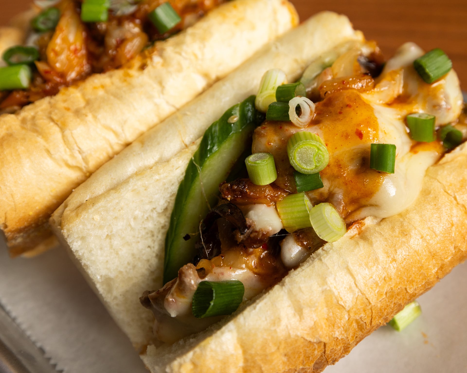 Marinated bulgogi beef, provolone, Pickled Pig kimchi, cucumber & scallion, finished with Korean BBQ and kimchi mayo on a toasted Amoroso's baguette.