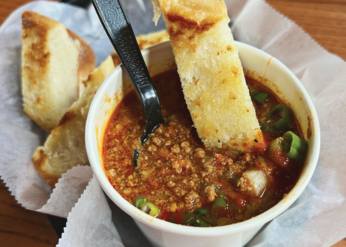 Bo Kho Vietnamese-style chili, cheddar, onions, scallions, sriracha and cilantro, sliced grilled baguette
